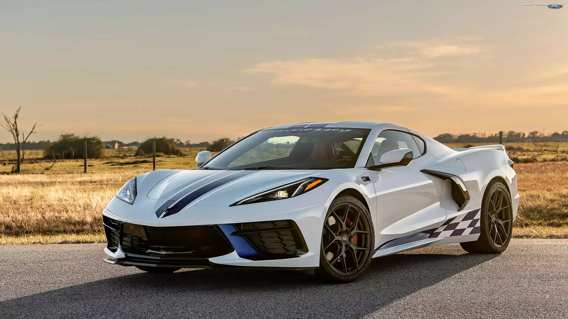 Łąka, Pobocze, Niebo, Chevrolet C8 Corvette Stingray, 2023, Hennessey Supercharge H700, Przód, Biały- Zdjęcia samochodów